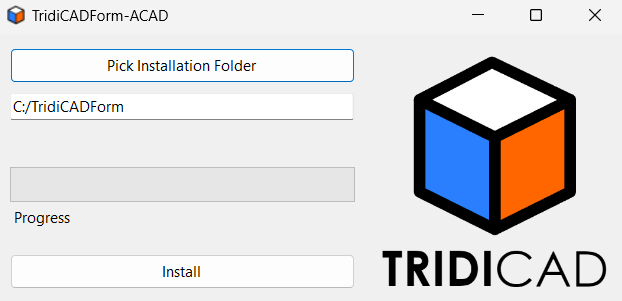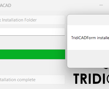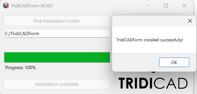You will see the message box above. We recommend the installation at the C:/TridiCADForm because we already preconfigured a quick launch Lisp program to help users to load on startup the program - however, if it is necessary to install it in other directory, make sure to modify the file start.lsp accordingly.