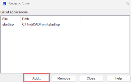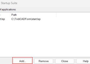 Click on the Add button displayed below and find the start.lsp file in your installation folder - if you installed it in a different folder you must change the directory in this lisp file.